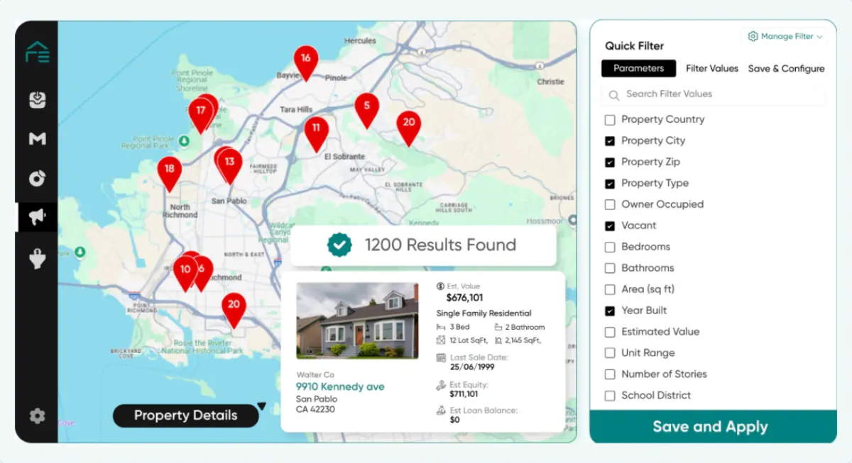 Easily build high-quality lead lists inside Resimpli by zip code or city — no third-party tools needed. View properties on a live map and instantly access skip-traced contact data.